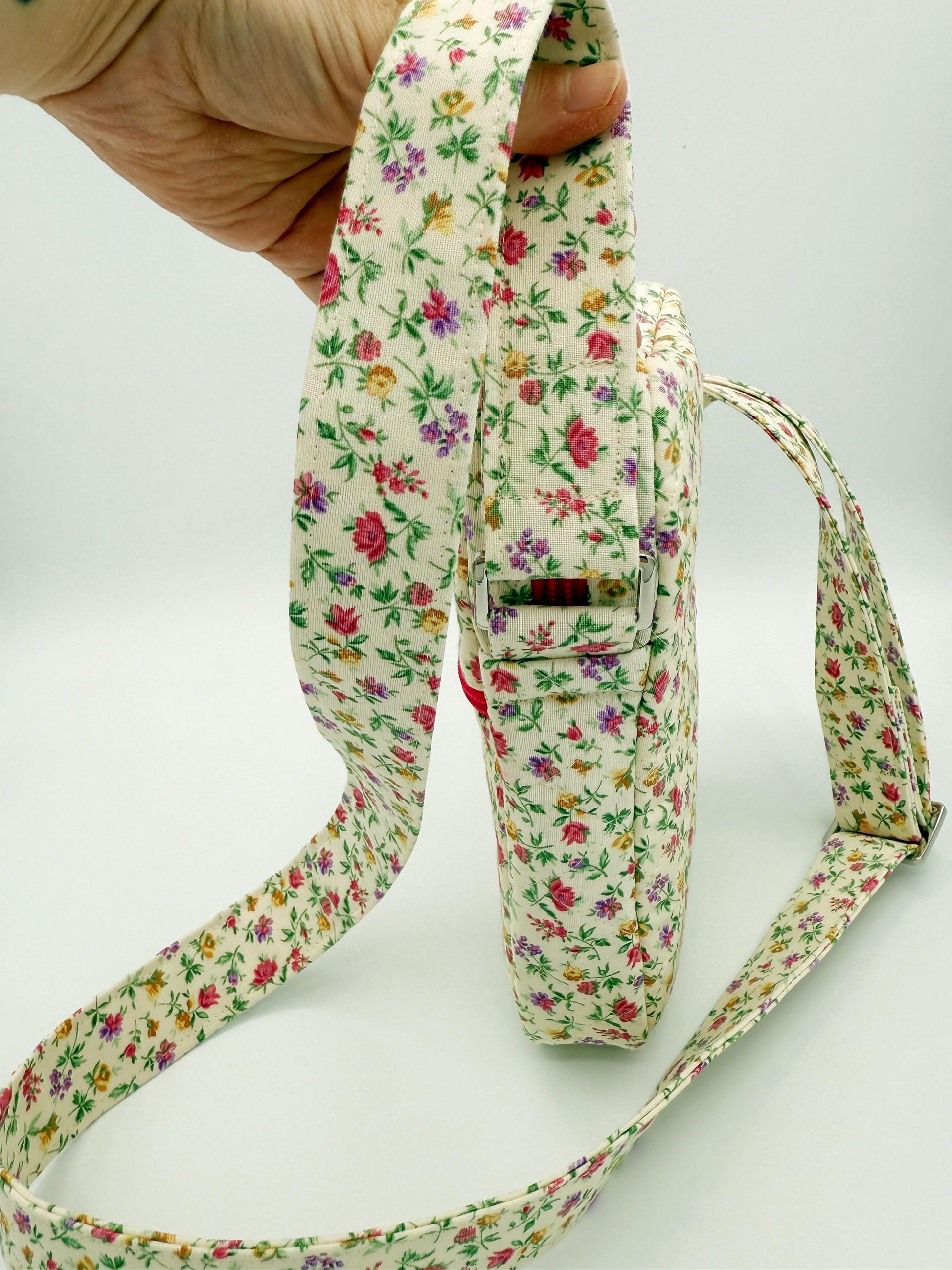This trendy quilted handmade bag is made out of 100% cotton fabrics. On the outside I used a beautiful ivory fabric that has a vintage style pink and purple floral print. Inside I used a solid tan fabric. Bag is super soft because I also used 100% cotton batting when quilting it. Adjustable strap so you can wear it how you wish. There's also a small zipper pocket on the front and main compartment has a matching zipper closure as well.