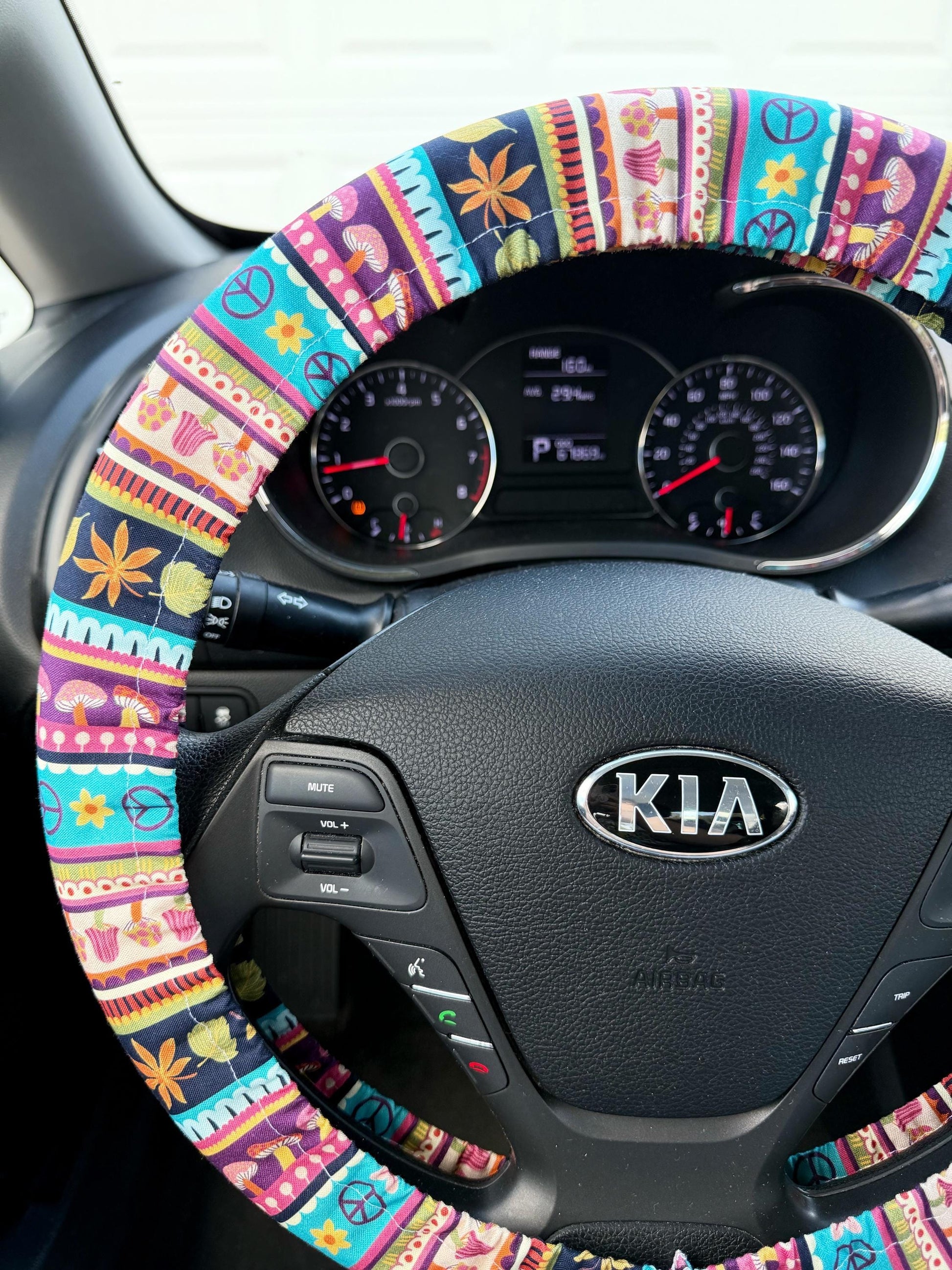 This groovy stripe handmade steering wheel cover is perfect for protecting your hands in cold and hot weather! Fabric features peace signs, mushrooms and cannabis leaves. Simply select your size for a custom fit and add some personality to your ride!