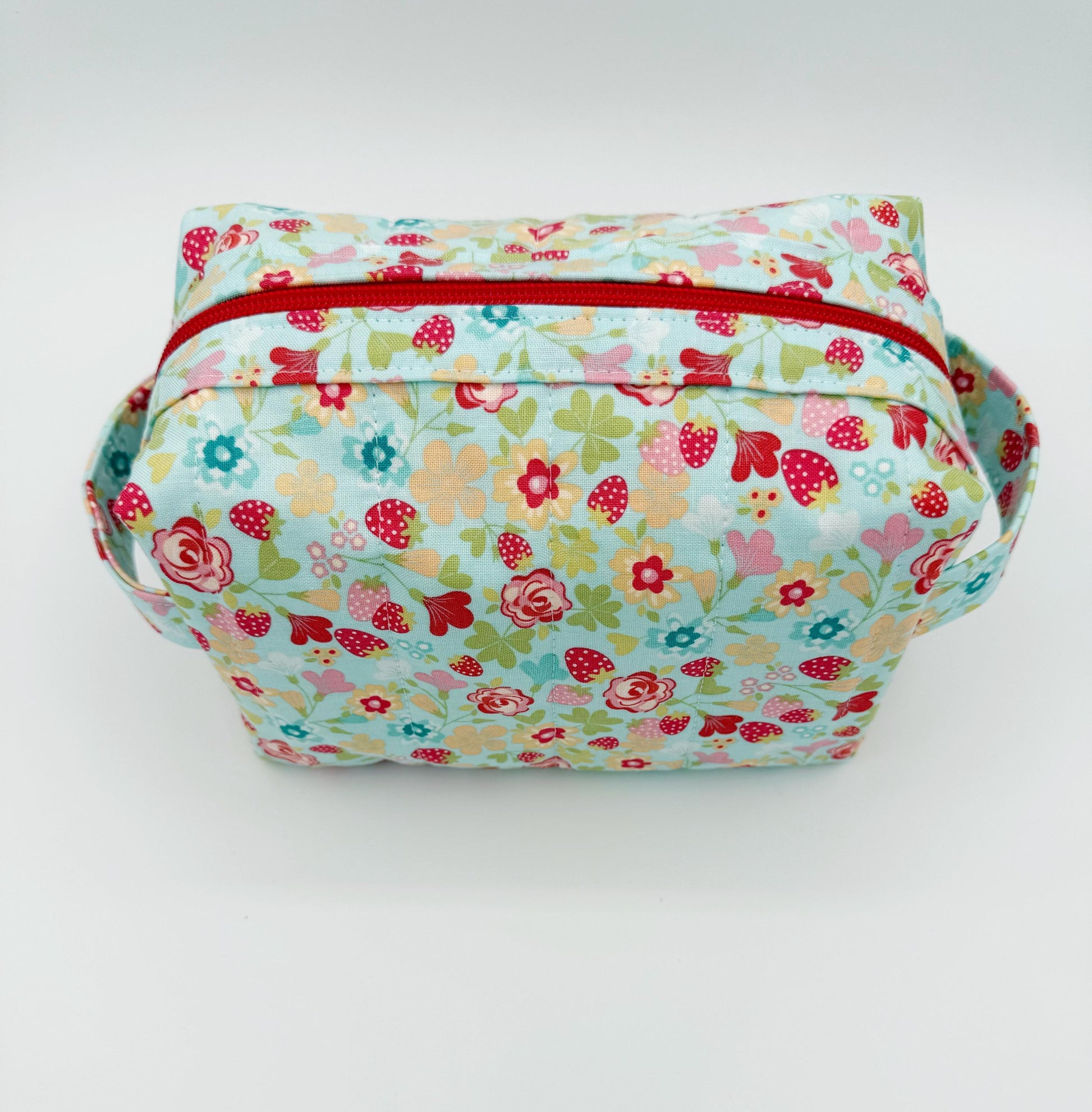 This print is a blue background with small red, yellow, pink and blue flowers & strawberries on a designer quilt cotton fabric. Inside is lined in a solid red to match the print on the main part of the bag, zipper is red that also coordinates with the print on the bag. Sew unique! This boxy bag also features 2 handles & a zippered closure. Quilted on my domestic sewing machine with great attention paid to detail! You're sure to be unique with these travel/organizer bags!