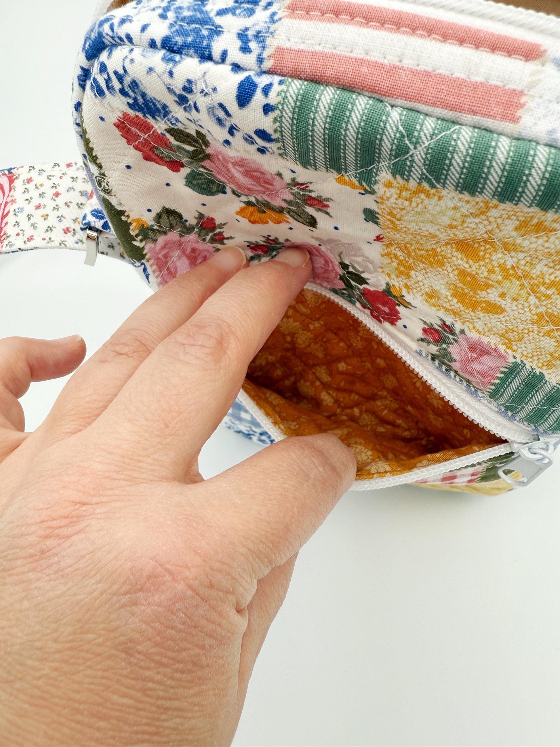 This trendy patchwork handmade bag is made out of 100% cotton fabrics. Outside fabric on bag is a faux patchwork that is so country vintage chic, on the inside I did a coordinating mustard floral fabric with cream binding (INSIDE OF BAG MAY BE A DIFFERENT MUSTARD FLORAL PRINT). Bag is super soft because I also used 100% cotton batting when quilting it. Adjustable strap so you can wear it how you wish. There's also a small zipper pocket on the front and main compartment has a matching zipper closure as well. Pictures show an example of what all can fit in this bag, if you'd like to see more pictures let me know!