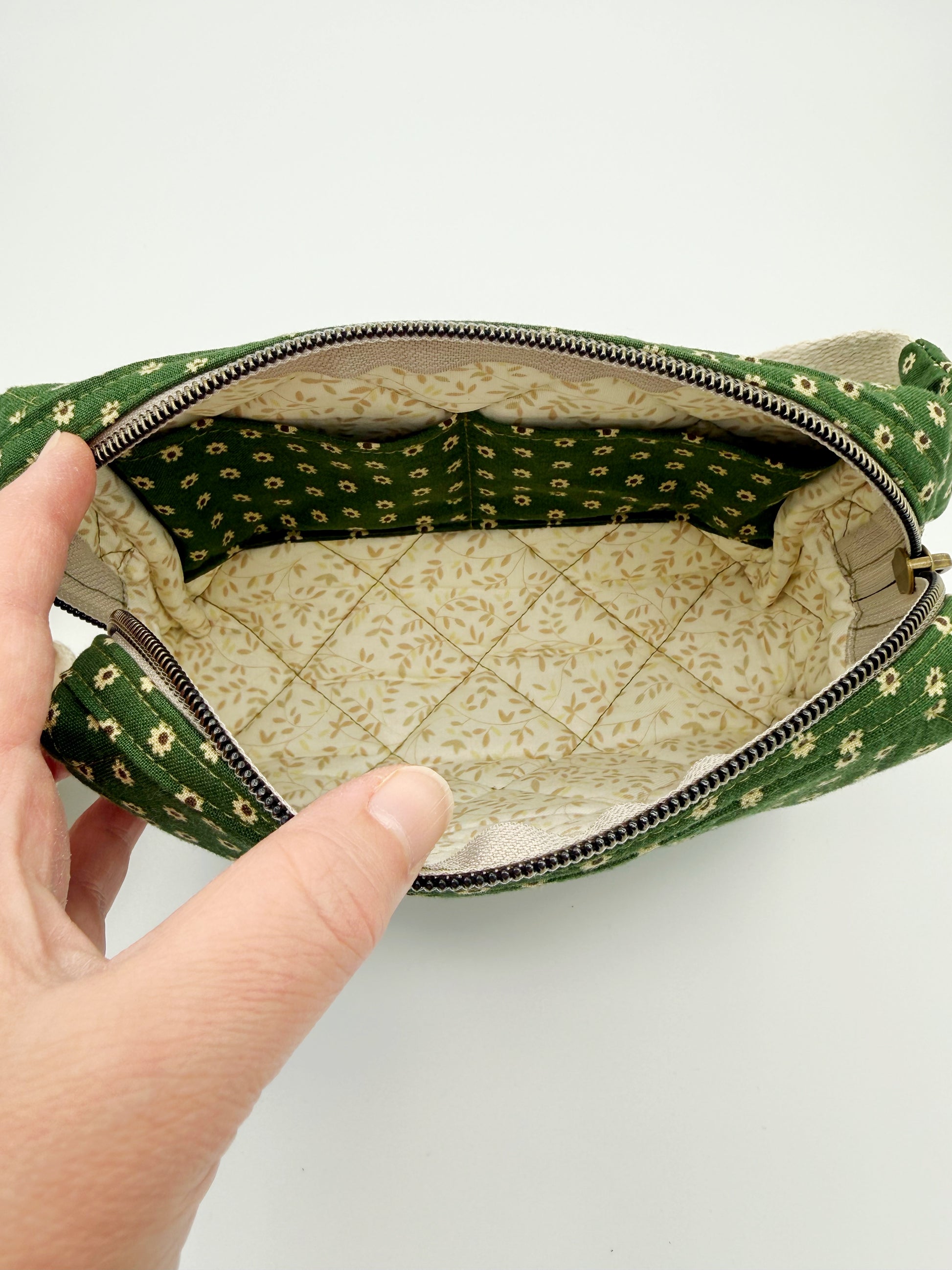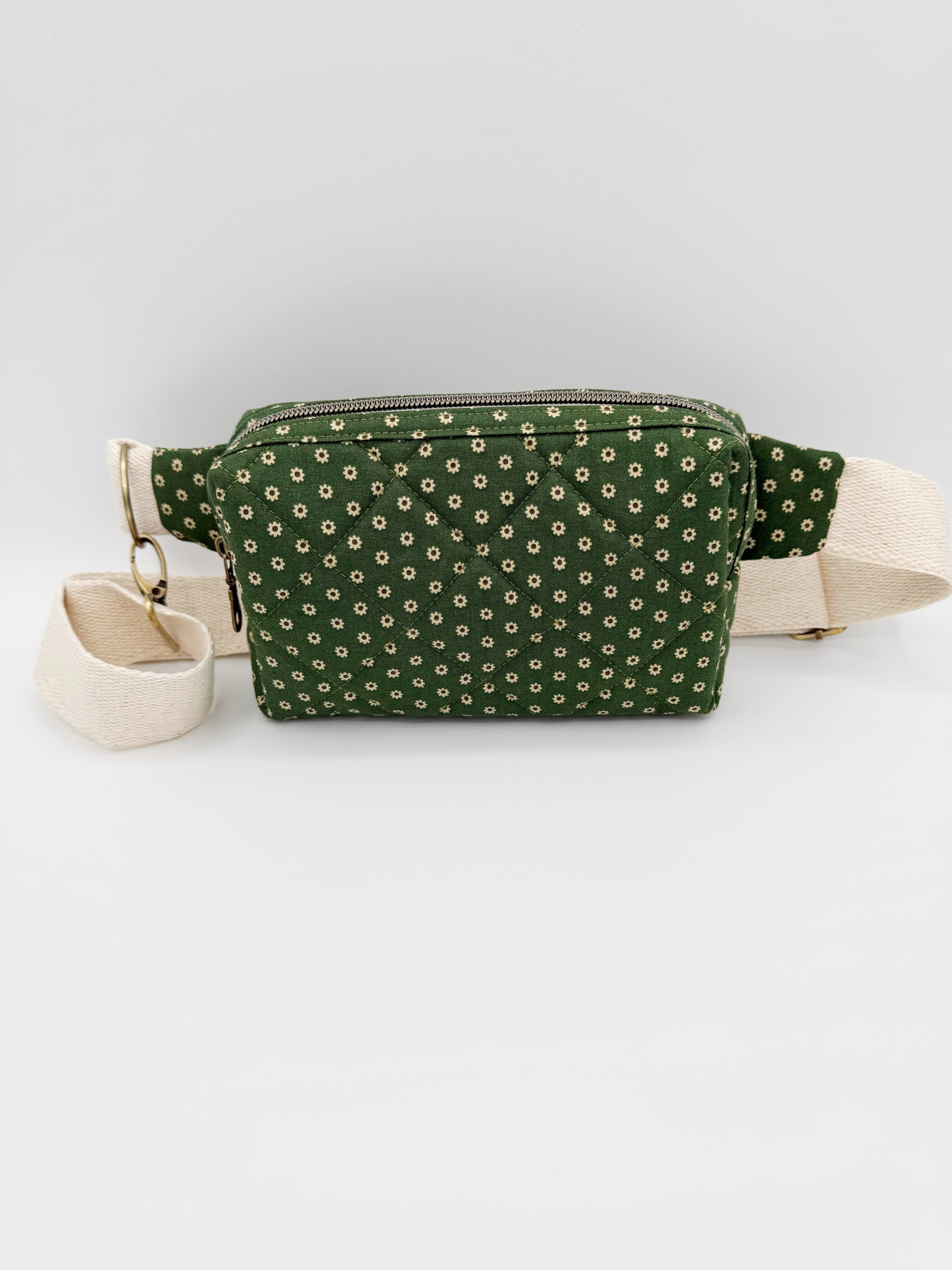 This handmade green floral quilted belt bag is your best travel companion or everyday bag! Fits conveniently as a crossbody style or fanny pack. On the inside I used a cream leaf print cotton fabric and included 2 pockets for some organization. Closure is a neutral zipper and antique hardware. Bag was also quilted by me on my domestic sewing machine.