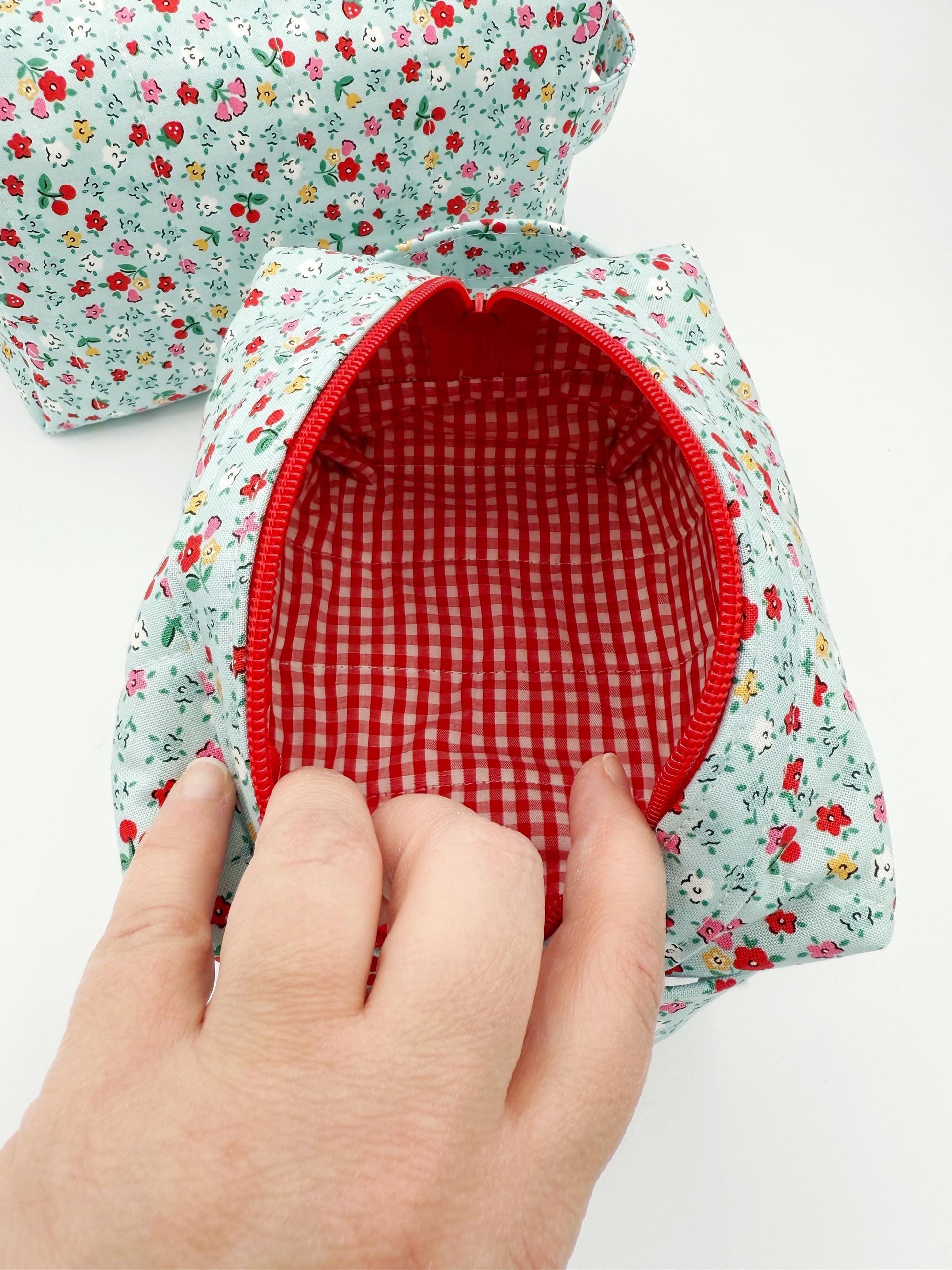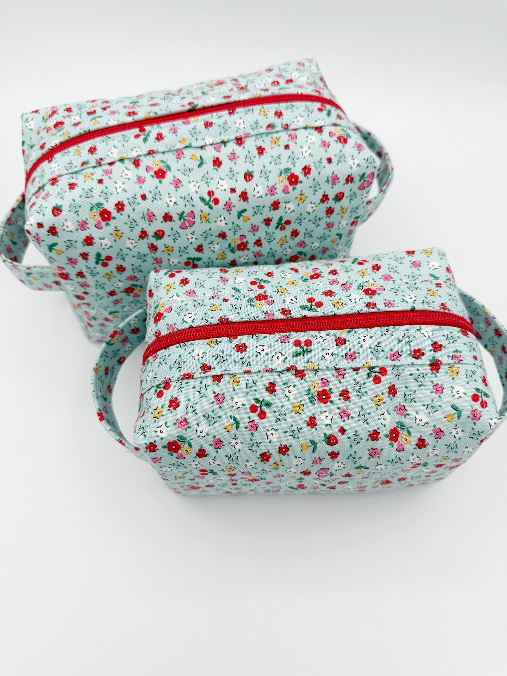 This print is a blue background with tiny flower blossoms, strawberries & cherries on a designer quilt cotton fabric. Inside is lined in a red gingham cotton & zipper is red. Sew unique! This boxy bag also feature 2 handles & a zippered closure. Quilted on my domestic sewing machine with great attention paid to detail! You're sure to be unique with these little travel bags!
