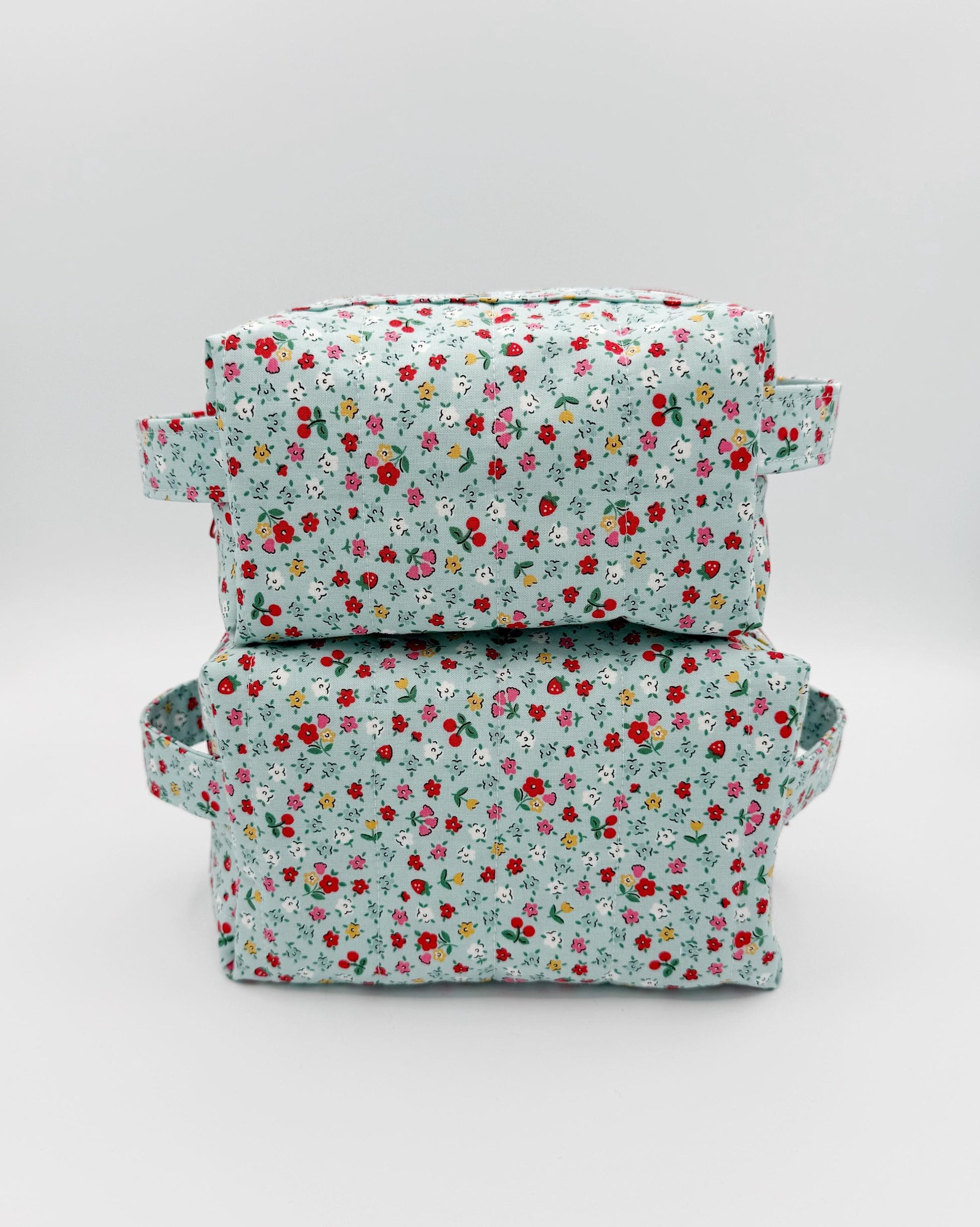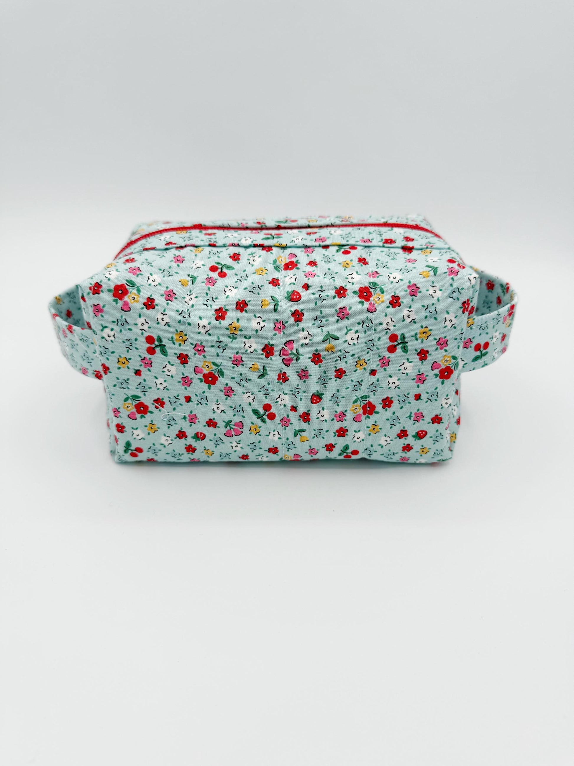 Small Blue Bitty Blossoms Quilted Boxy Bag, Handmade Toiletry Bag