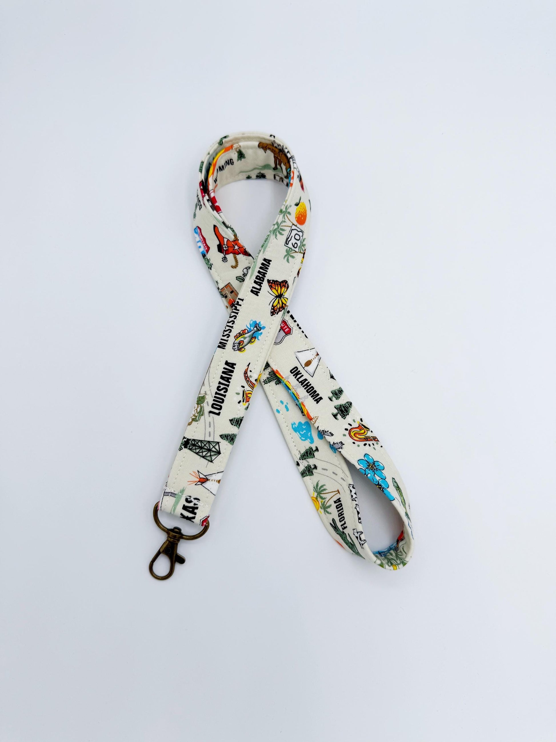 Handmade states lanyard. Made out of 100% cotton. Measures 21" from back of neck to end of hardware & 1" wide.