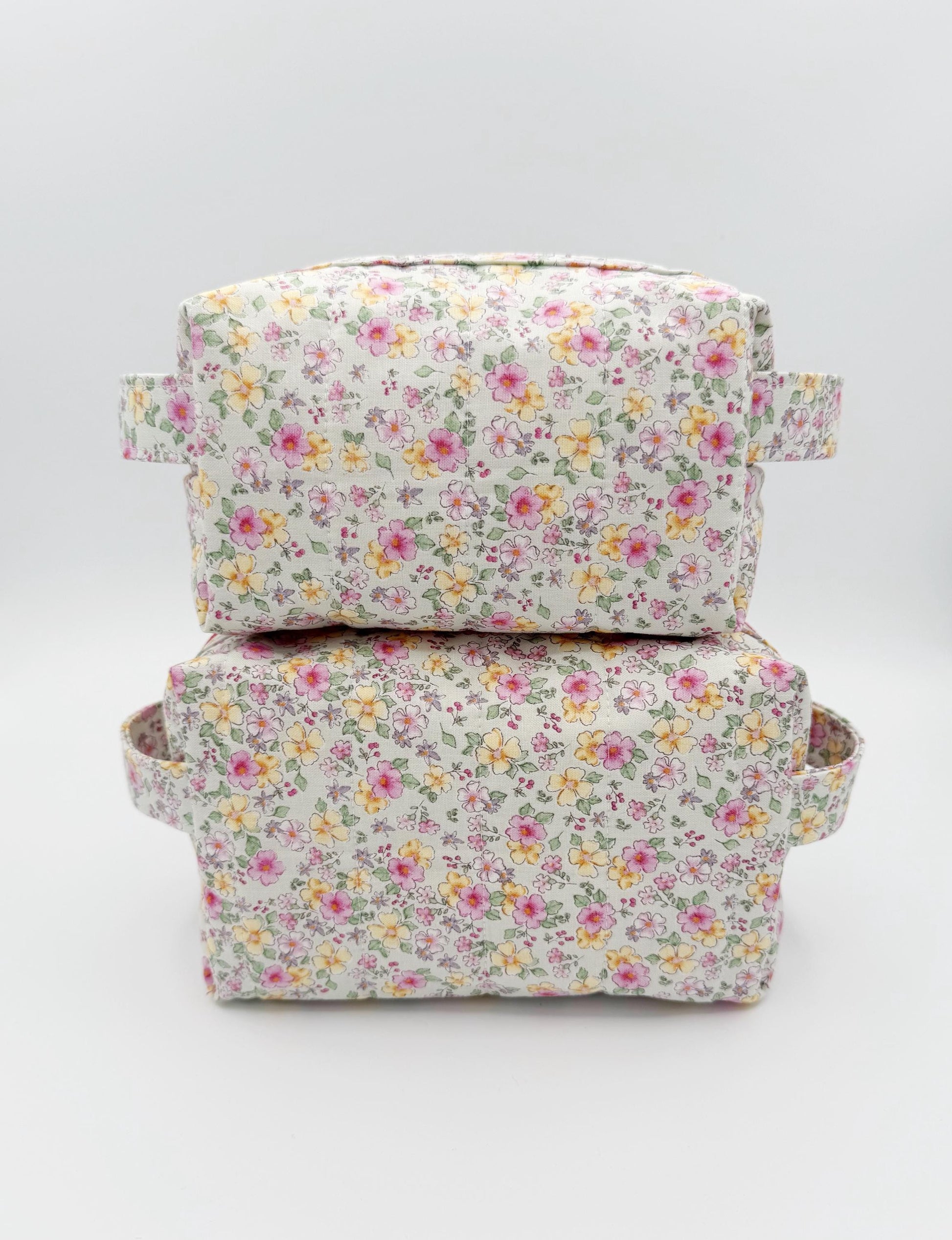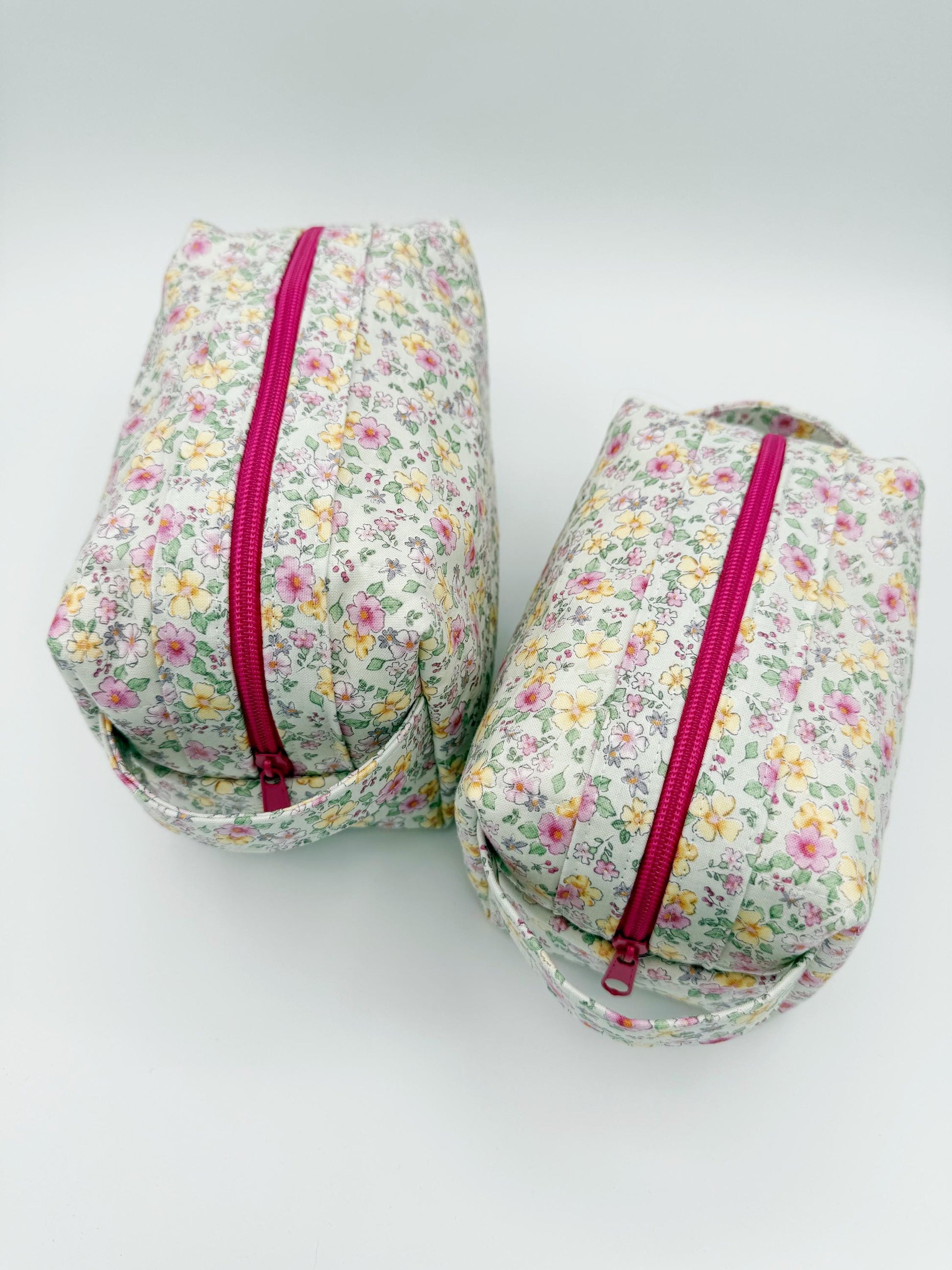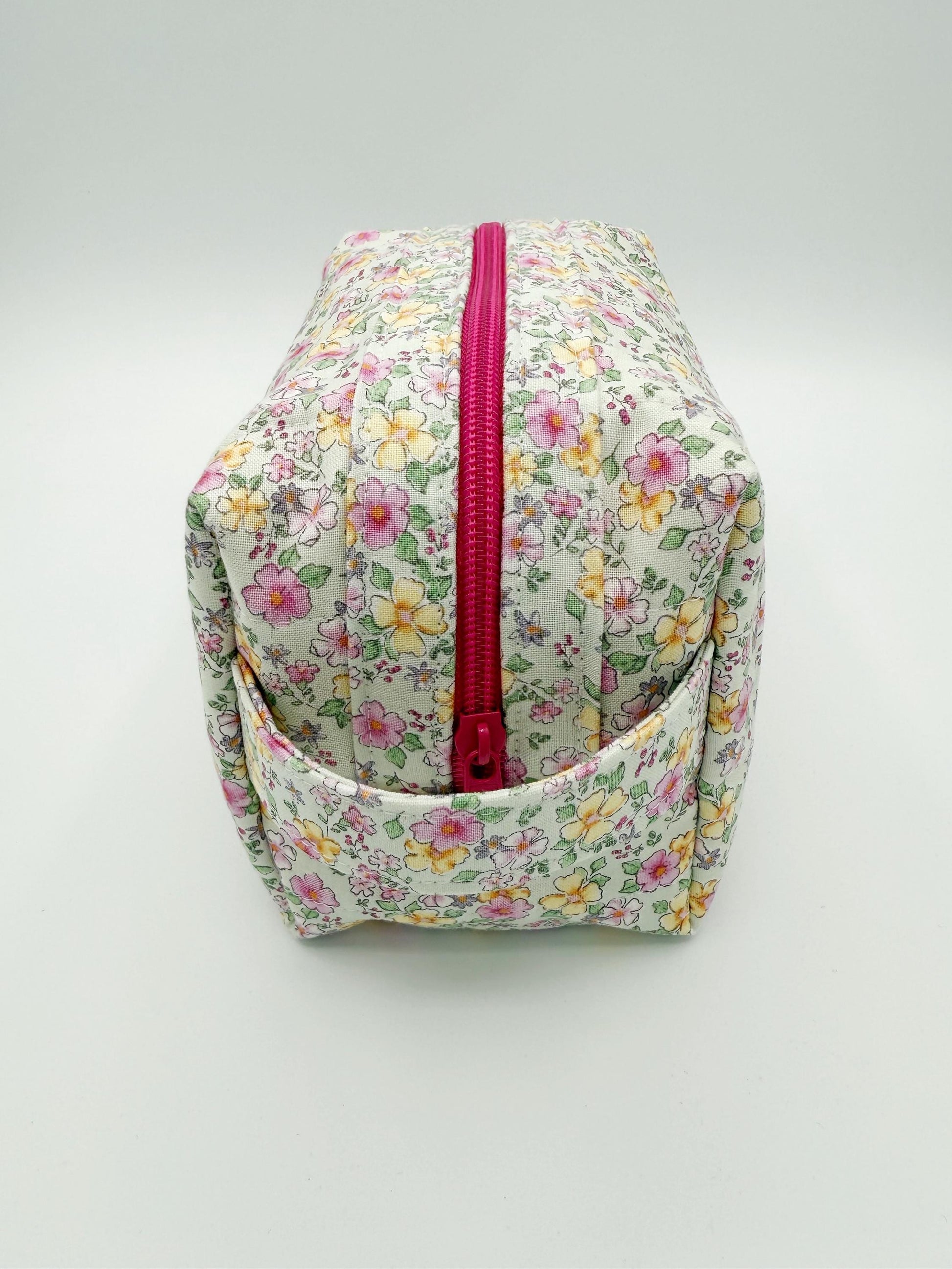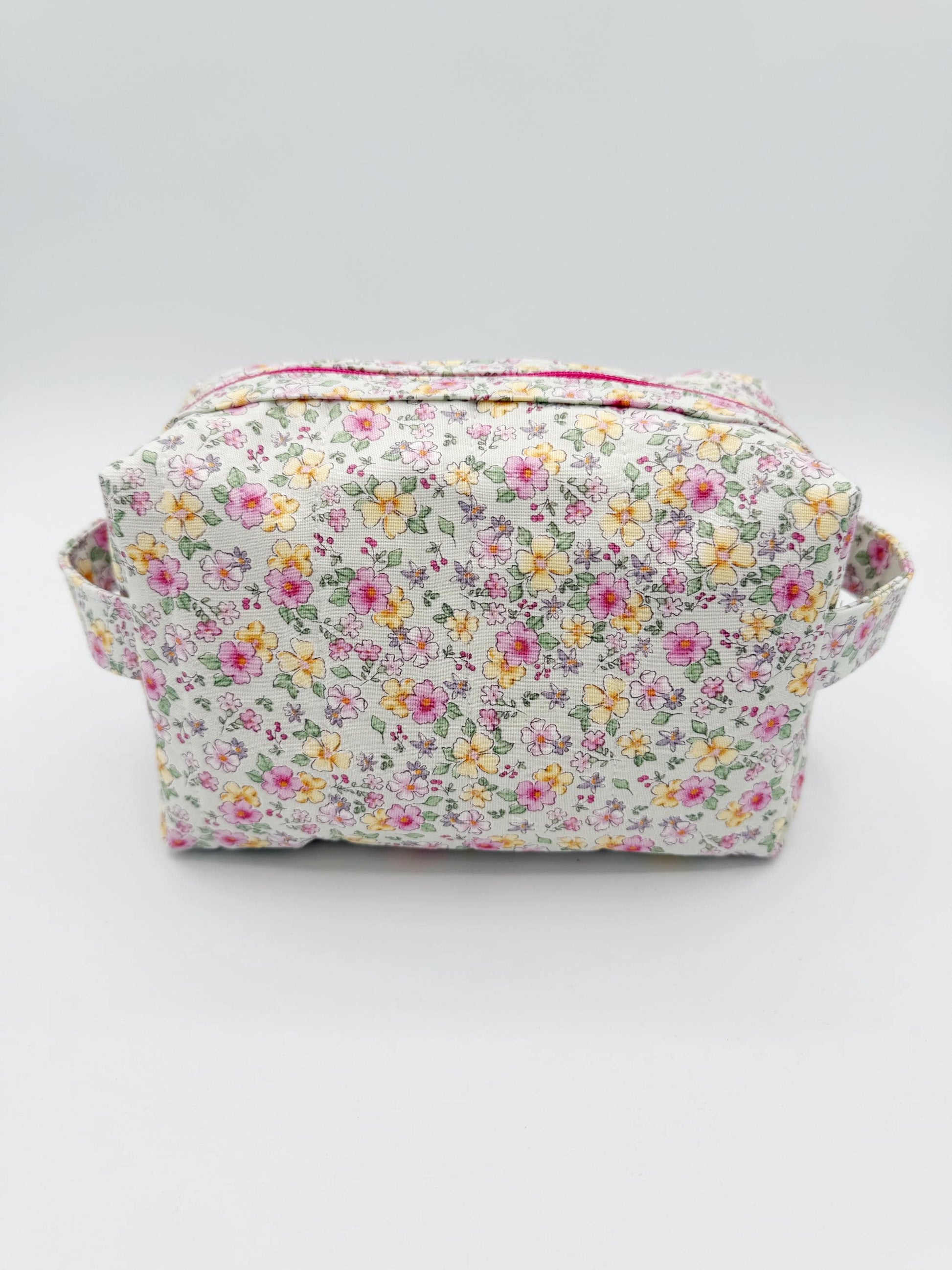 This organizer bag print is a spring mint green background with pink and yellow flowers on a designer quilt cotton fabric. Inside is lined in a solid pink to match the print on the main part of the bag and zipper is also pink Sew unique! This quilted bag also features 2 handles & a zippered closure. Quilted on my domestic sewing machine with great attention paid to detail! You're sure to be unique with these little travel bags!